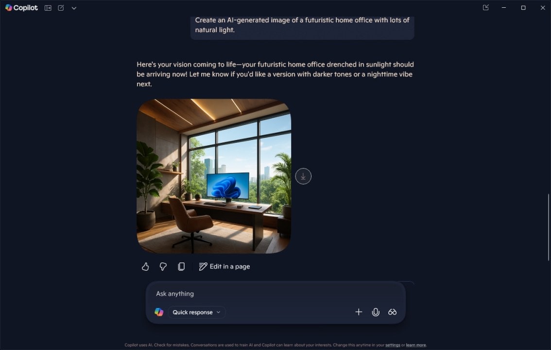• Example: “Create an AI-generated image of a futuristic home office with lots of natural light.” How to Generate Text and Images with Microsoft Copilot in Windows 11 Like A Pro: The Ultimate Guide