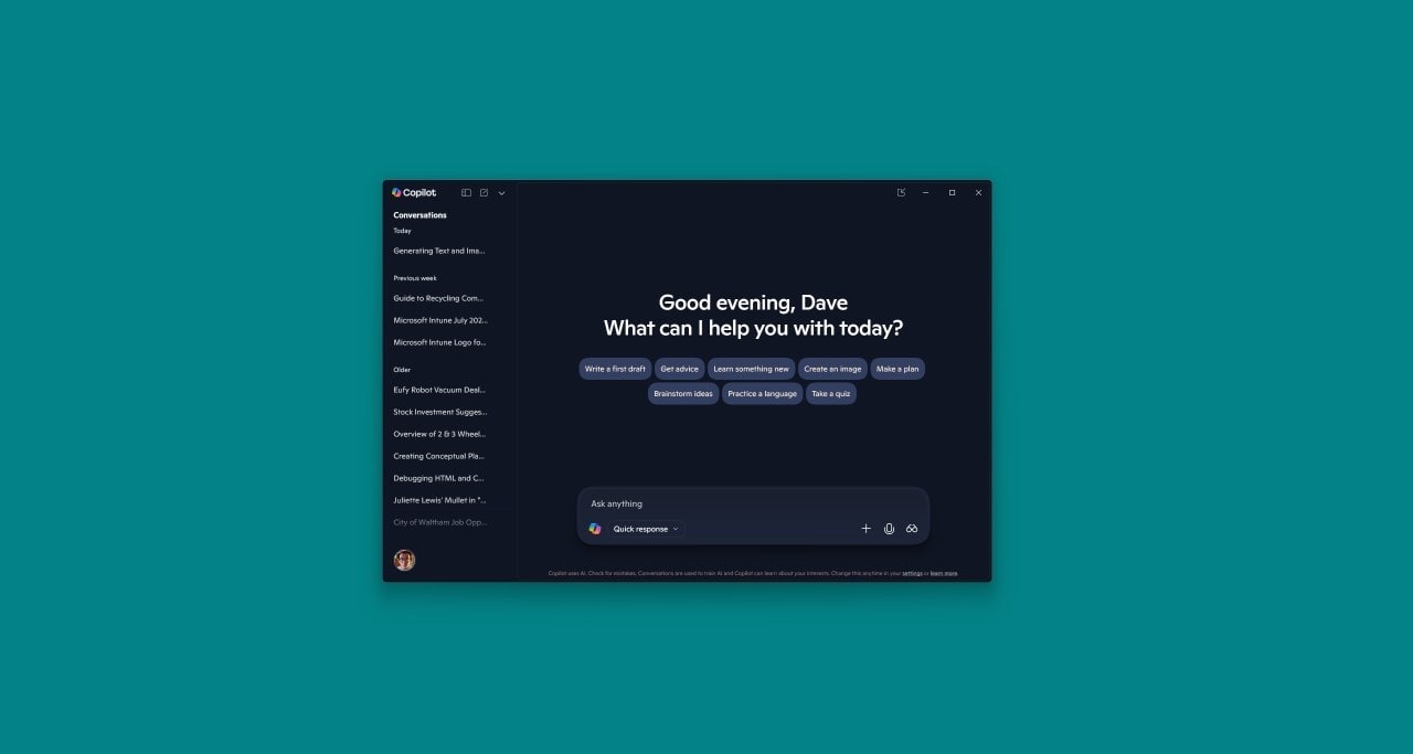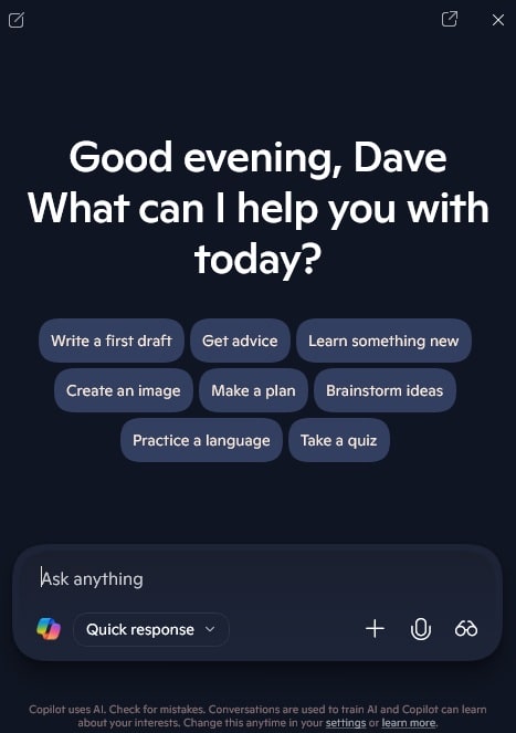 1. Open Copilot: Use the taskbar icon or Windows Key + C shortcut.