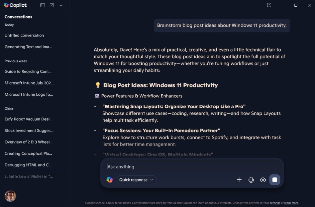 • “Brainstorm blog post ideas about Windows 11 productivity.” How to Generate Text and Images with Microsoft Copilot in Windows 11 Like A Pro: The Ultimate Guide