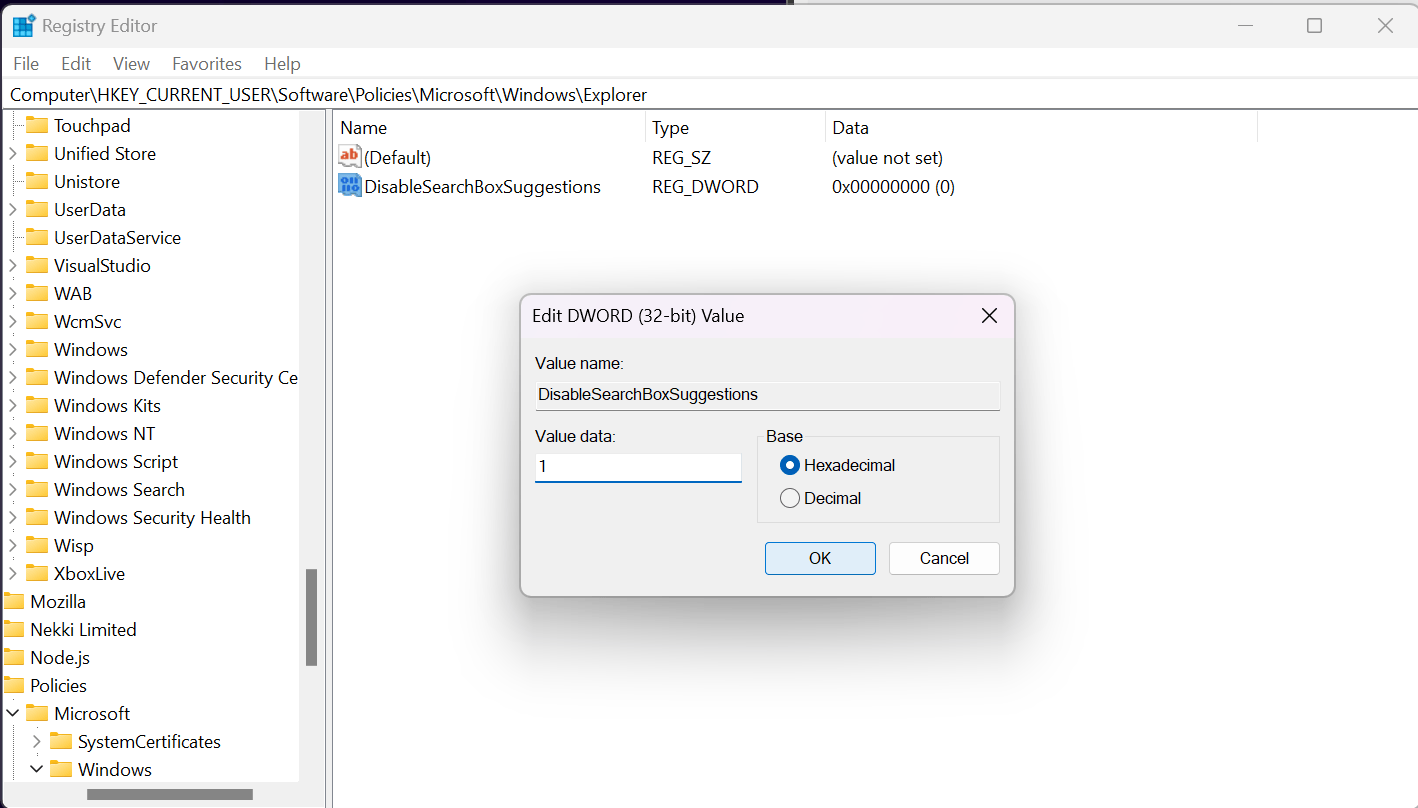 Explorerkey, create a new DWORD (32-bit) Value namedDisableSearchBoxSuggestions, and set its value to1and click OK. Restart your PC for the changes to take effect.